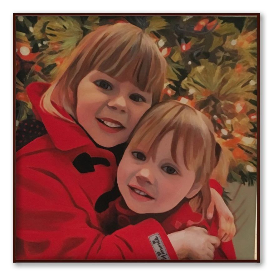 These two visit the same spot every year for Christmas pictures. 12x12 oil on gallery wrapped canvas